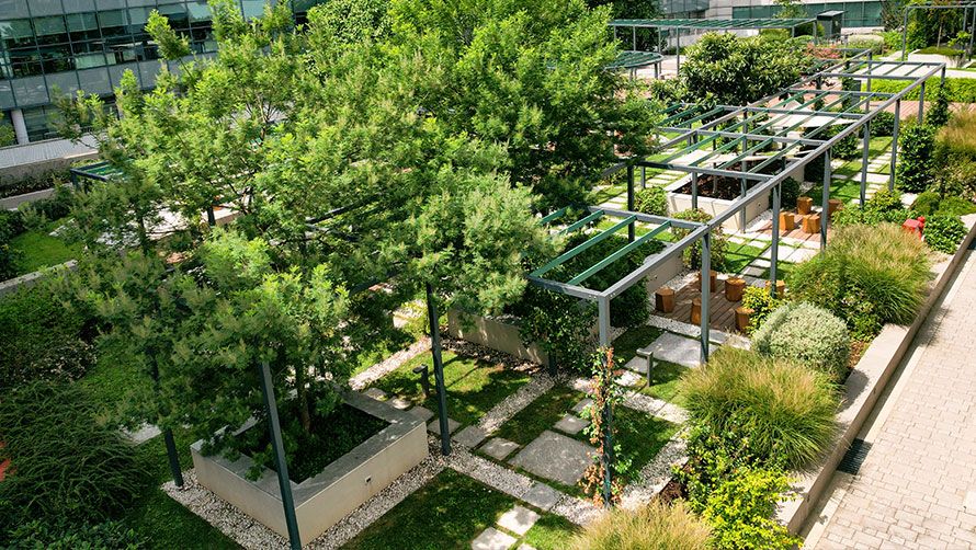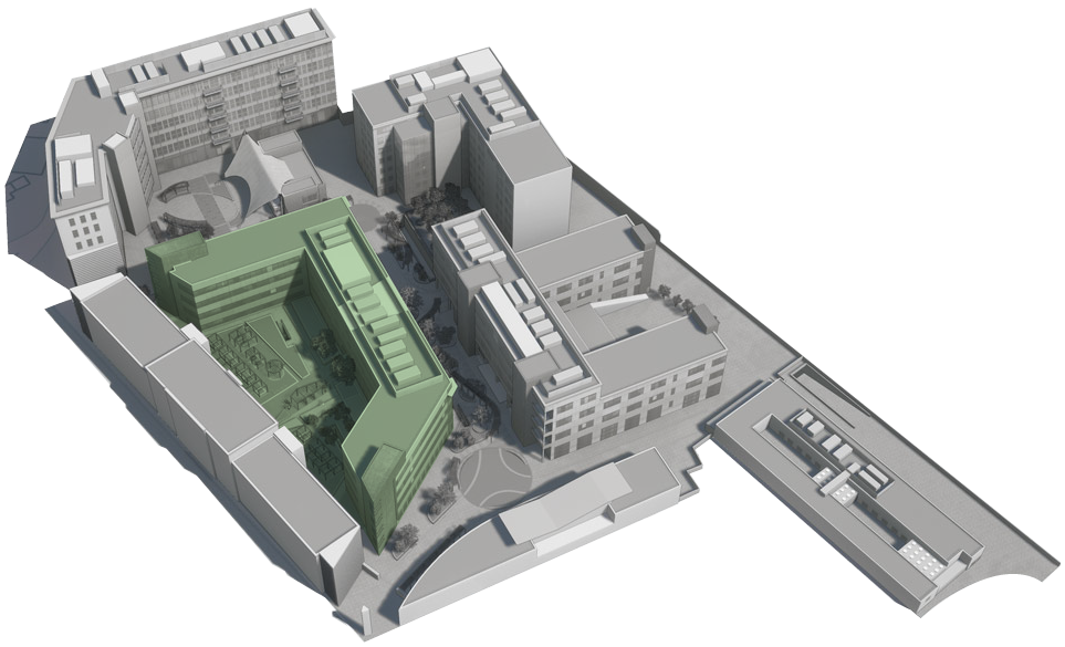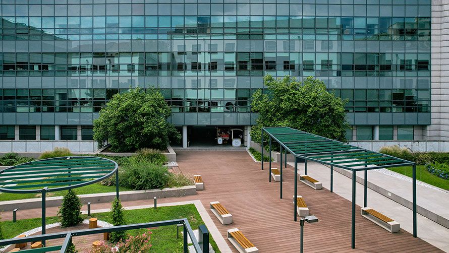 L’affaccio privilegiato sul Giardino Lineare e sull’Arcipelago, unito alla posizione equidistante dai due ingressi, rende l’edificio un punto di equilibrio e connessione all’interno del centro.
